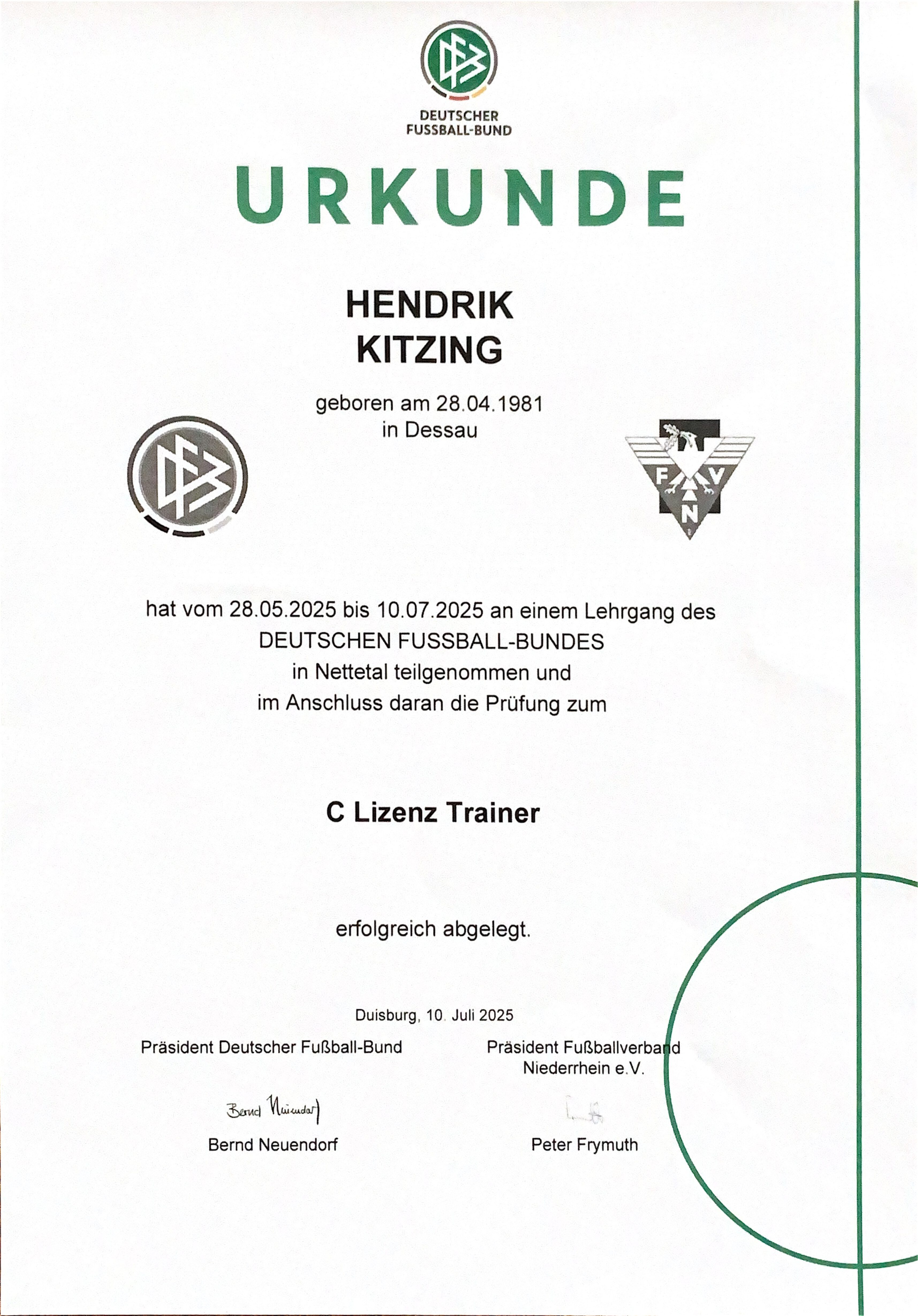 Mit meiner langjährigen Erfahrung als Amateur-Fußballer und meinem Engagement als Kinderfußballtrainer (C Lizenz) bringe ich meine Leidenschaft für den Ballsport direkt zu den Kindern. Dabei setze ich auf moderne Trainingsmethoden, insbesondere neurozentriertes Fußballtraining: Hier werden klassische Übungsformen durch kognitive, koordinative und visuelle Herausforderungen ergänzt. So fördern wir gezielt die Spielintelligenz, Wahrnehmung und Entscheidungsfähigkeit der Kinder und steigern gleichzeitig deren technische Entwicklung. Gerade als Vater weiß ich, wie wichtig es ist, jungen Menschen nicht nur fußballerische Fähigkeiten, sondern auch soziale Werte und Selbstvertrauen zu vermitteln und sie auf ihrem Weg zu unterstützen. Mit meiner Leidenschaft für innovatives Training und meinem persönlichen Einsatz möchte ich talentierte Spieler ausbilden und junge Persönlichkeiten in ihrer Entwicklung begleiten – damit sie selbstbewusste, verantwortungsvolle und vielseitige Menschen werden.